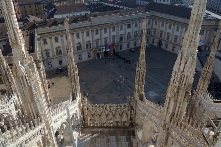 The experience culminates where Milan earns its skyline: fast-track lift access to the Duomo Rooftop Terraces, a high walkway among 135 marble spires and over 3,000 statues, with the full breadth of the city — and on clear days, the Alps — laid out below. Ten guests maximum. A pace that lets you actually see it.